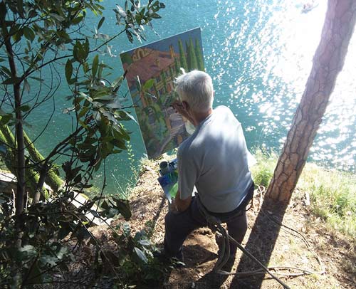 Jerry Fresia, strapped in a harness and fastened to a tree while he paints on the edge of a cliff on Lake Como, Italy